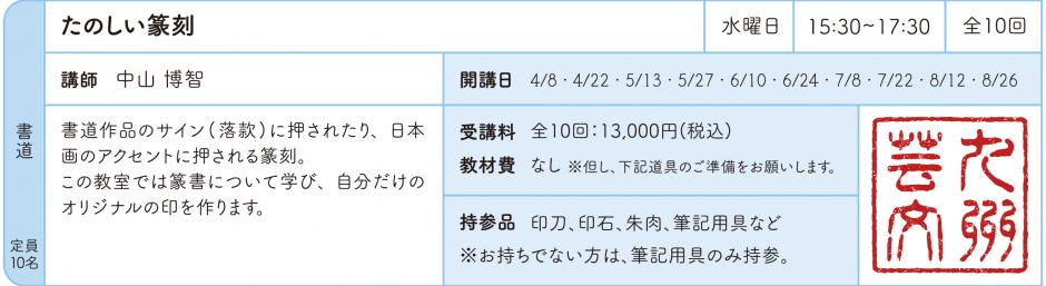 | 持参品 | 印刀、印石、朱肉、筆記用具など ※お持ちでない方は初回時に講師より持参品の説明を行いますので、筆記用具のみご持参ください。 |