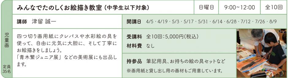 | 持参品 | 筆記用具、お持ちの絵の具セットなど ※画用紙と貸し出し用の画材もご用意しています。 |