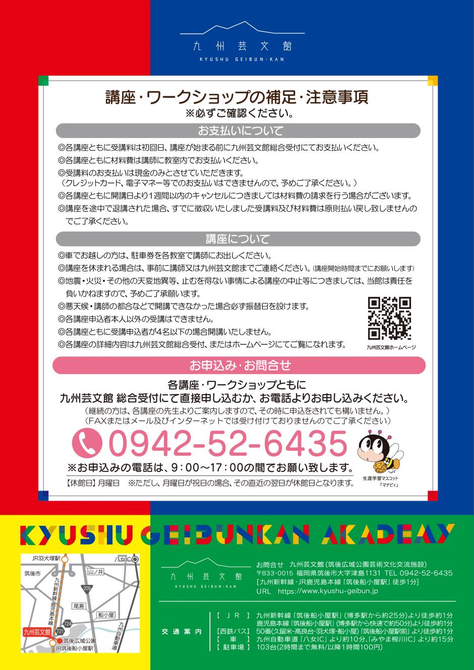 - 各講座・ワークショップともに九州芸文館芸文館総合受付、 またはお電話よりお申し込みください。FAXまたはメール及びインターネットでは受け付けておりませんのでご了承ください。