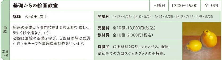 | 持参品 | 絵画材料(絵具、キャンパス・筆・油等) ※初めての方はスケッチブックのみご持参ください。 |