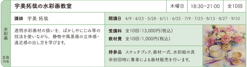 | 持参品 | スケッチブック、画材一式、水彩絵の具 ※初回時に業者による画材販売を行います。 |