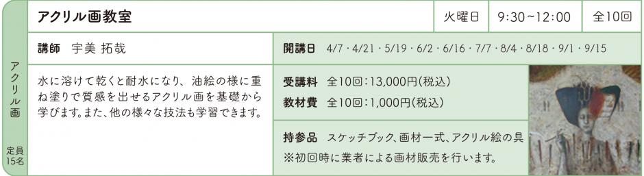 | 持参品 | スケッチブック、画材一式、アクリル絵の具 ※初回時に業者による画材販売を行います。 |